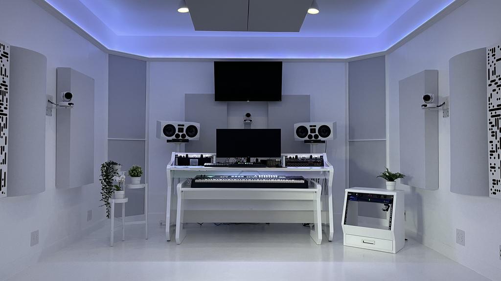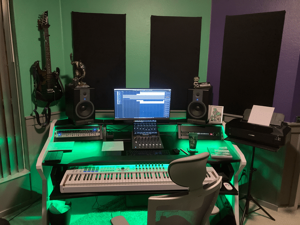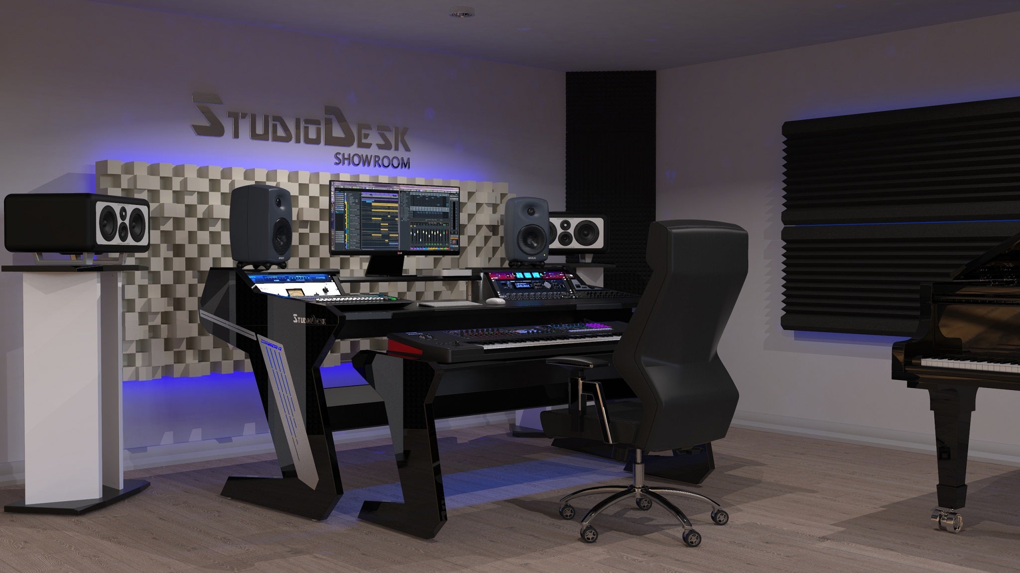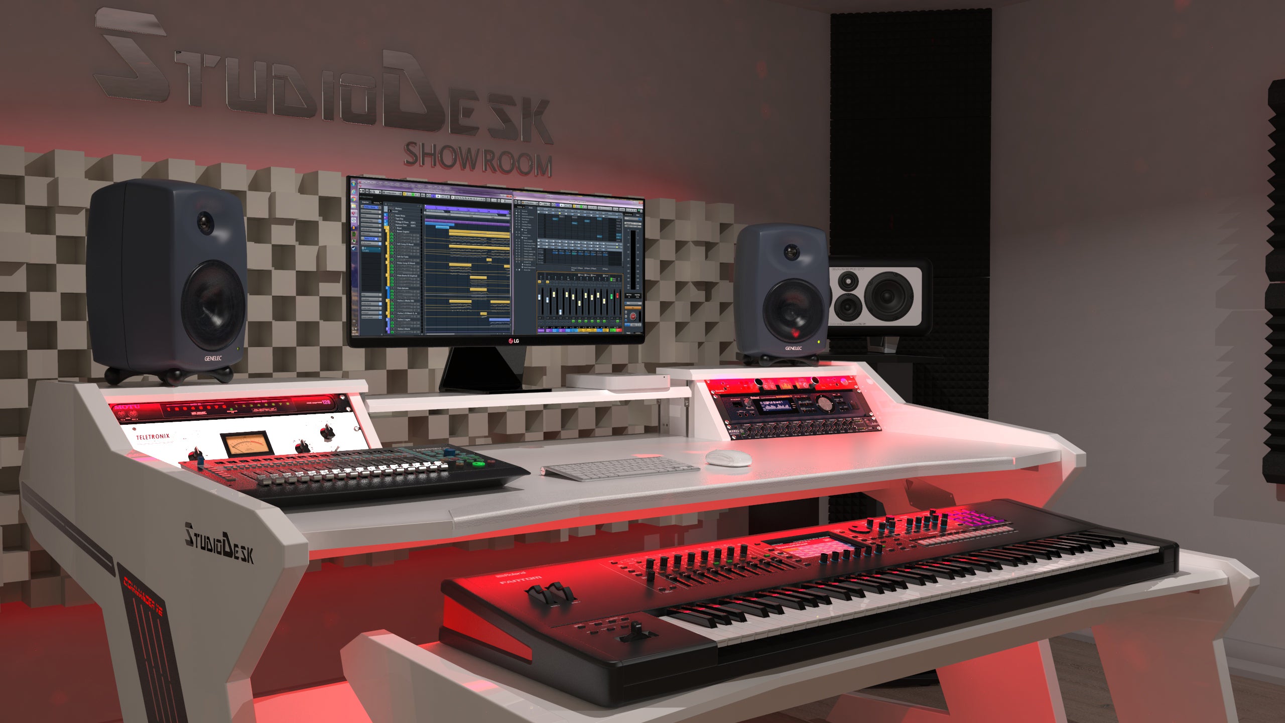 Studio workstation with a perfectly organized and optimized ergonomic space. The state-of-the-art innovative design and careful planning of this desk allow you to have your complete home studio set-up on small space. A successor of our first most popular desk get's even better. In Hight adjustable monitor shelf, an Interchangeable padded armrest, angled design, RGB LED serial lights combined with the aluminum aesthetic application on the sides gives this desk stunning looks. These are just a few new features. The spacious central portion of the desk will accommodate quite big mixing consoles. Our keyboard stand will fit the biggest 88 key workstations on the market. Once the keyboard is in place, your keys will match piano height for the best playing experience. Pull the keyboard stand out when you need to play. Push it under the desk when you don't. Additional rack space for up to 8 standard rack units is optional by adding a floor rack cabinet on casters. The comfortable interchangeable padded armrest is available in 4 colors, White, Black, Wine Red, and Ferrari Red. Please check the pictures in the gallery and select your preferred color. For additional colors please contact us.