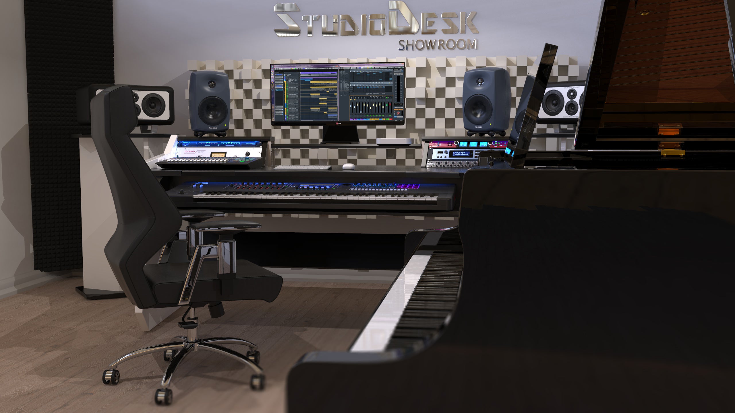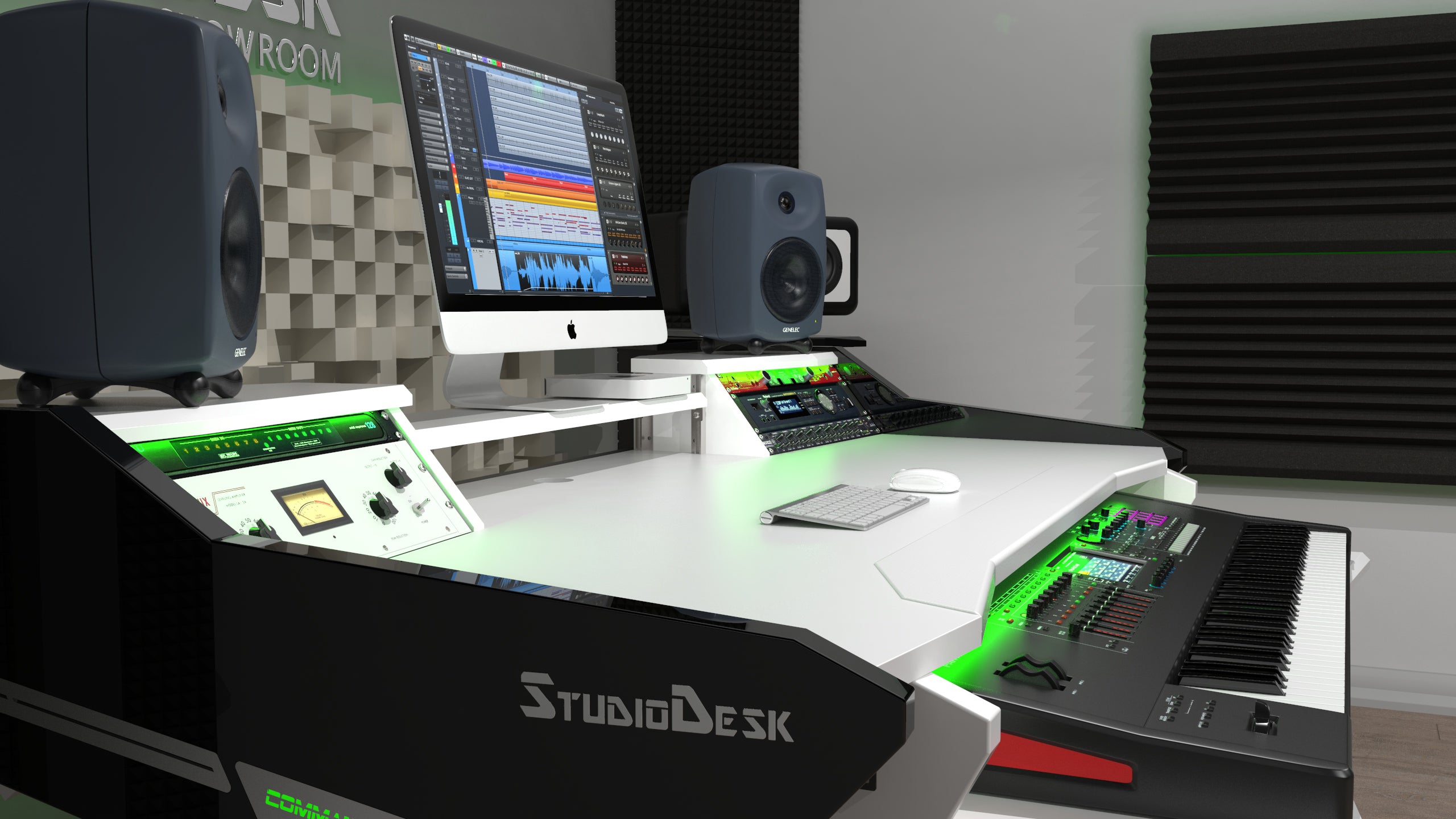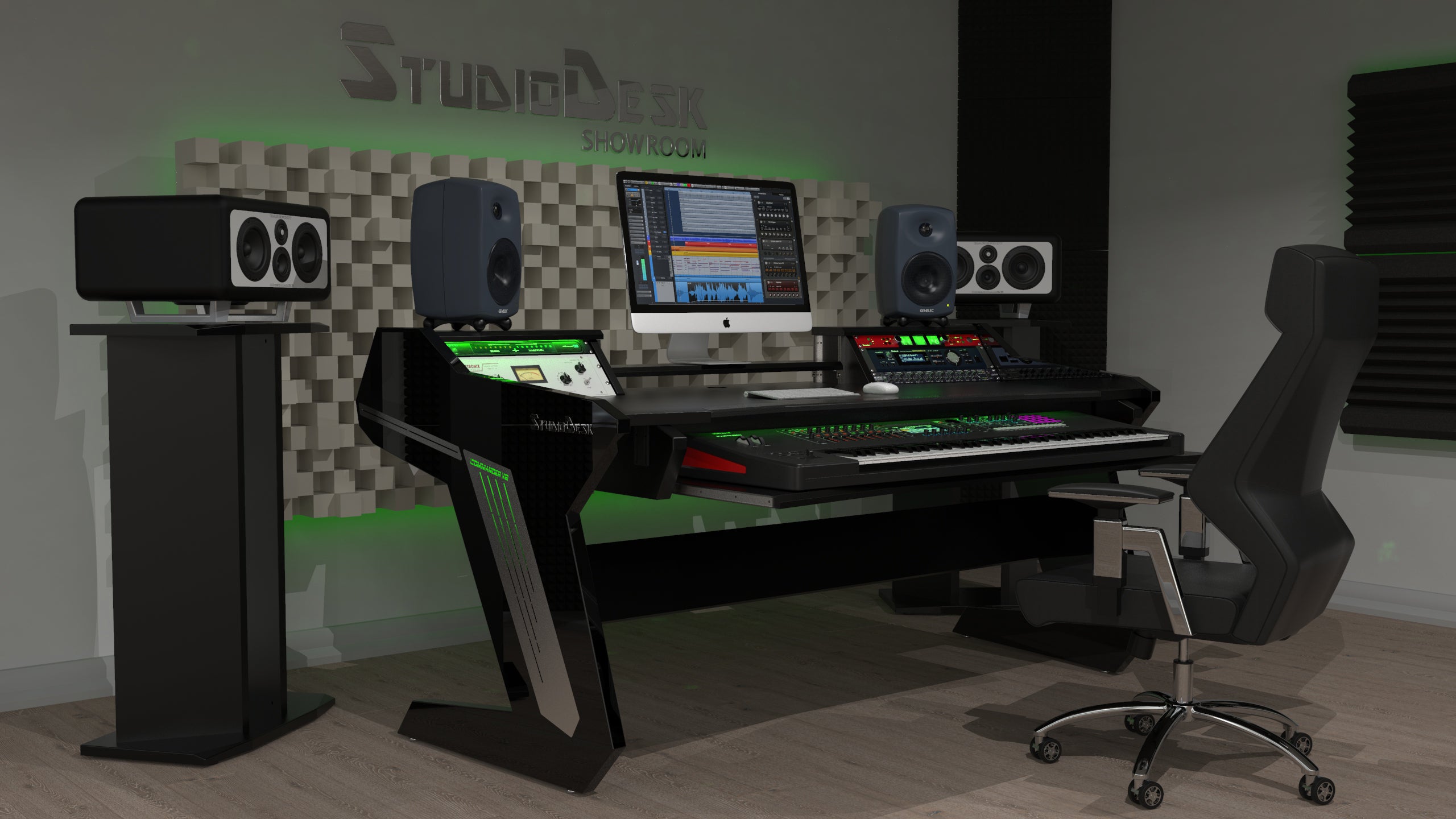 Studio workstation with a perfectly organized and optimized ergonomic space. The state-of-the-art innovative design and careful planning of this desk allow you to have your complete home studio set-up on small space including 88 keyboards underneath the main desk surface. A successor of our first most popular desk get's even better. In Hight adjustable monitor shelf, an Interchangeable padded armrest angled design, RGB LED serial lights combined with the aluminum aesthetic application on the sides gives this desk stunning looks. A large 88 keyboard pull out option is added to this configuration. These are just a few new features. The spacious central portion of the desk will accommodate quite big mixing consoles. Additional rack space for up to 8 standard rack units is optional by adding a floor rack cabinet on casters. The comfortable interchangeable padded armrest is available in 3 colors, Black, Wine Red, and Ferrari Red. Please check the pictures in the gallery and select your preferred color. For additional colors please contact us.