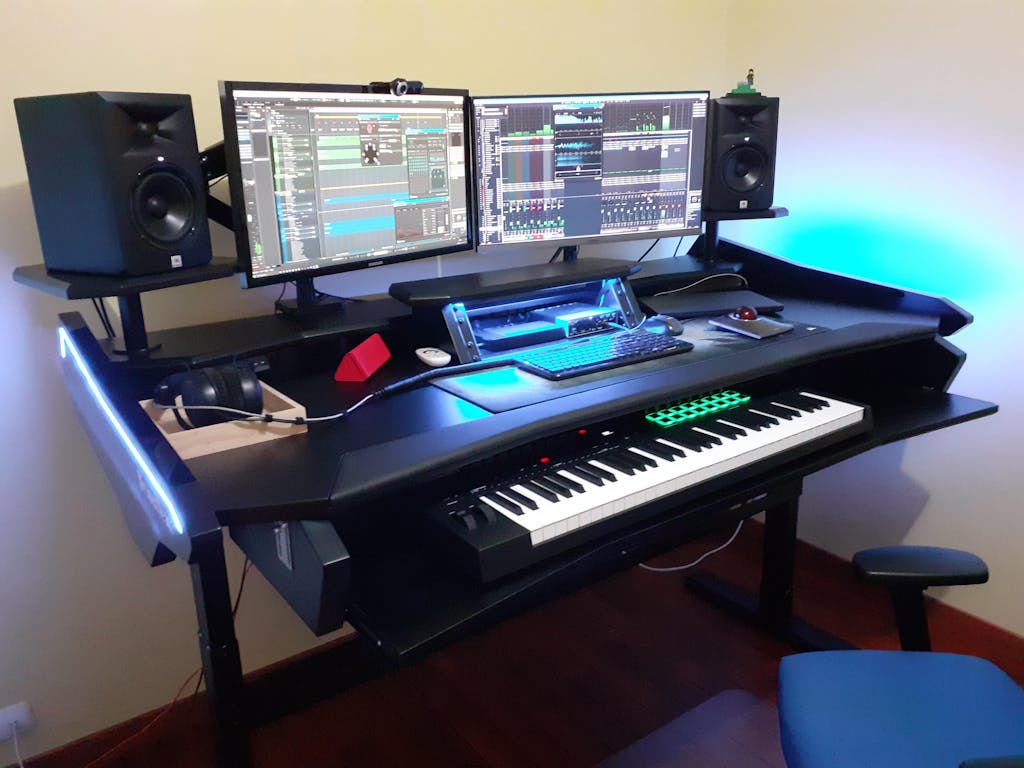 Enterprise Electric is our second Sit & Stand workstation. Enterprise Electric is the same as our Classic Enterprise desk sitting on the electric adjustable platform. Your complete studio is organized around this optimized ergonomic space. With this workstation, the decision, if you are going to sit or stand this day, is a matter of the push on the button. Find the best height for you no matter your posture. This Brand new state-of-the-art design and it's features bring a new shine to your studio. Centered Rack space with 3U rack bay is always within your reach. There are additional 1U rack spaces on each side of the rack bay. Thanks to brand new adjustable Pull-out keyboard tray Enterprise Electric will be home for the biggest 88 key workstations on the market. Once the keyboard is in place, your keys will match piano height for the best playing experience. Pull your keyboard out when you need to play. Don't worry it goes smooth. Push it under the desk when you don't. Swivel speaker shelves can be easily moved left and right allowing you to find your perfect sweet spot. Shelves holders are designed to hold safely up to 16 kg (35 lbs) speakers. The comfortable padded armrest is available in 3 colors, Black, Wine Red, and Ferrari Red. Please check pictures in the gallery and select your preferred color during ordering. For additional colors please contact us. Cable management will hide your cables out from the site.