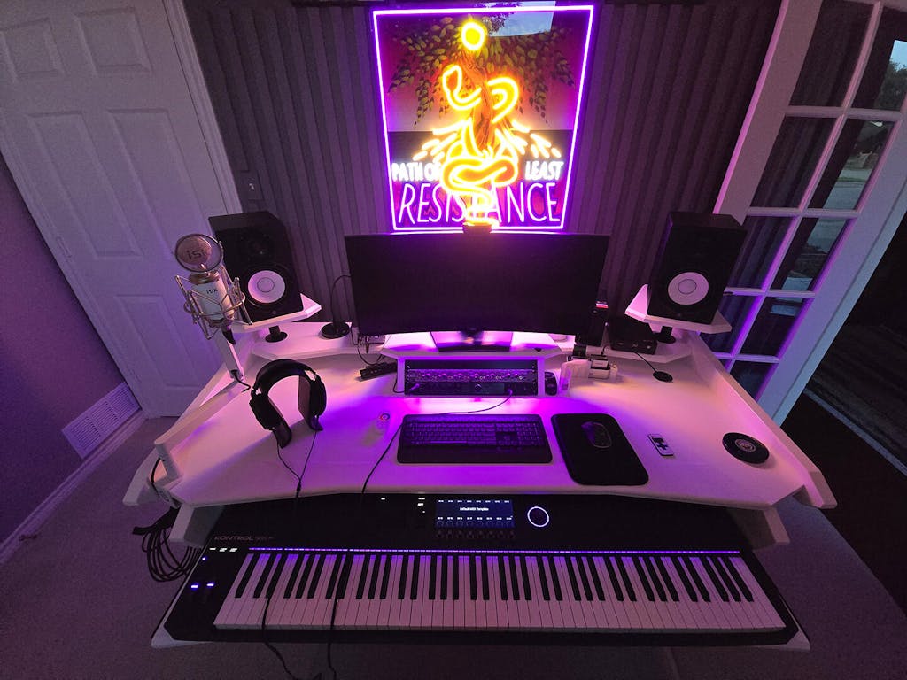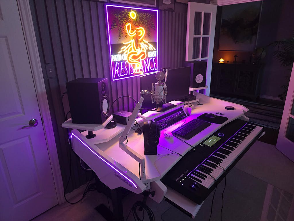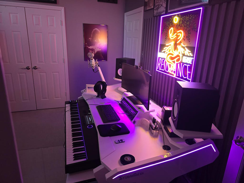 An RGB LED light stripe on the desk both sides and above the racks is an additional aesthetical detail serial to every desk giving you beautifully dimmed light in your studio, enhance your inspiration.