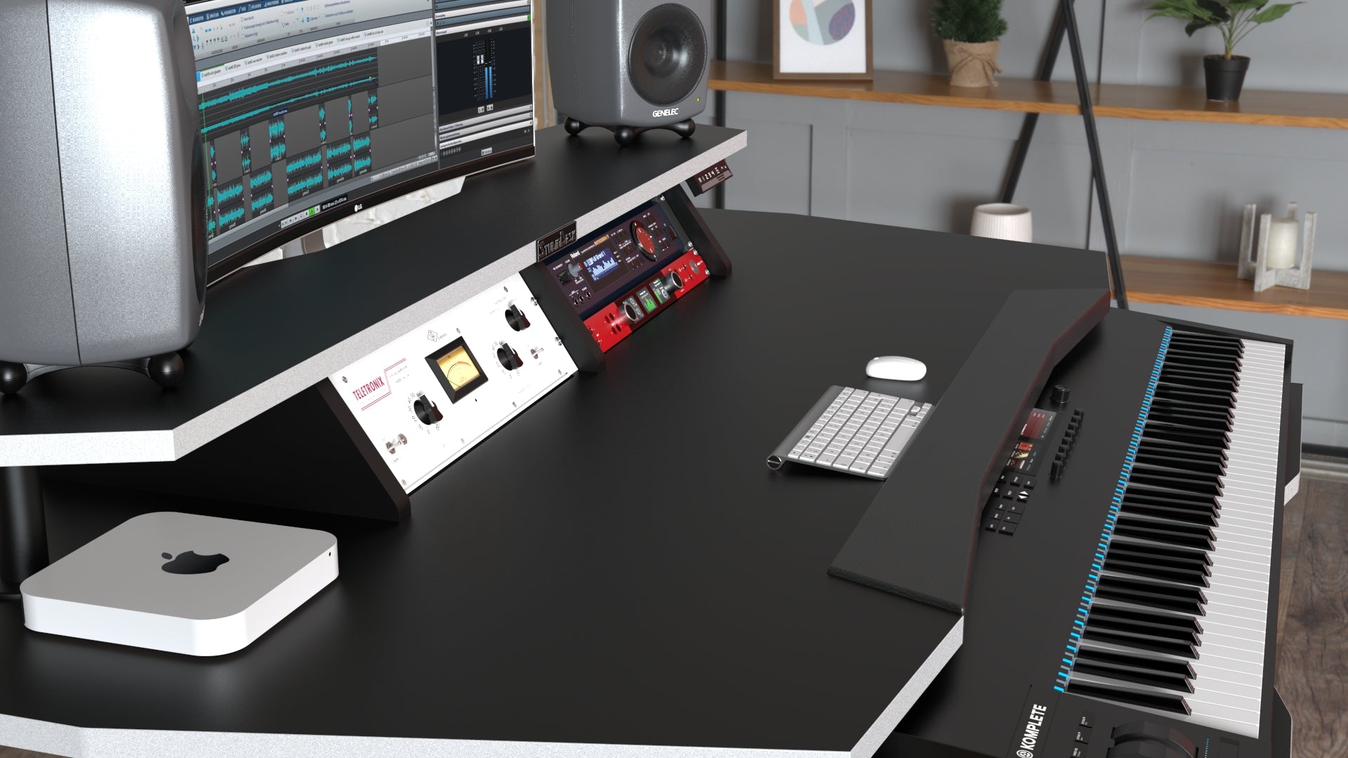 The FANTOM is another version of the StudioDesk workstation designed to fill the demand of people who looking for practicality and price point over premium materials and finishes. Sit and stand workstation with memory functionality, six standard rack spaces, Adjustable height Keyboard Pull out for 88 keys, padded armrest, carefully planned ergonomics, and features that will make you happy and healthy. Press a memory button, stand up, and let the blood flow through your body while producing. Dancing to your music is allowed too
