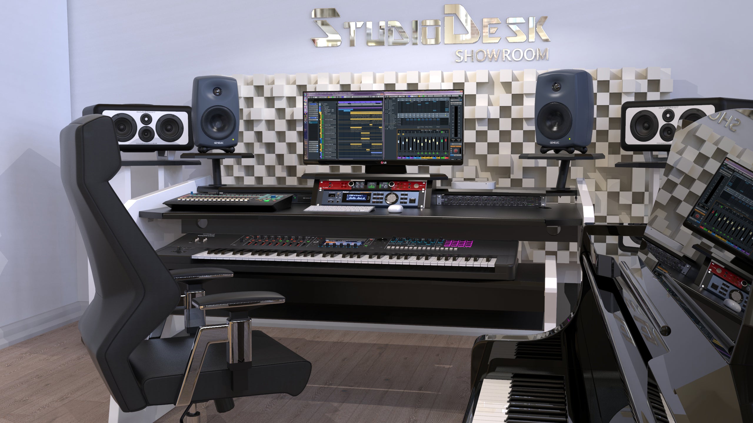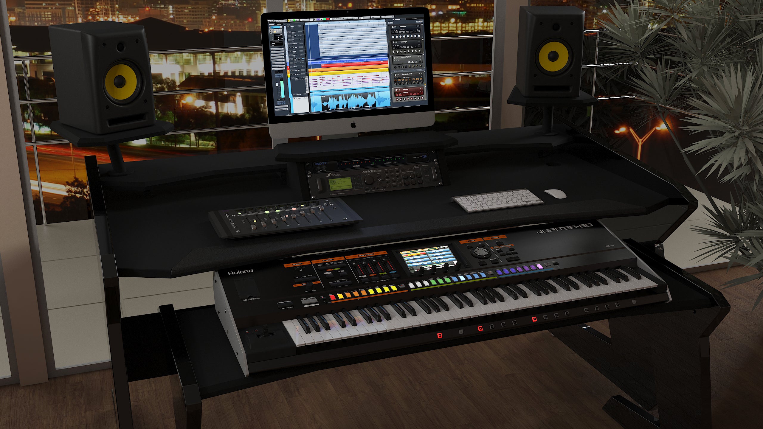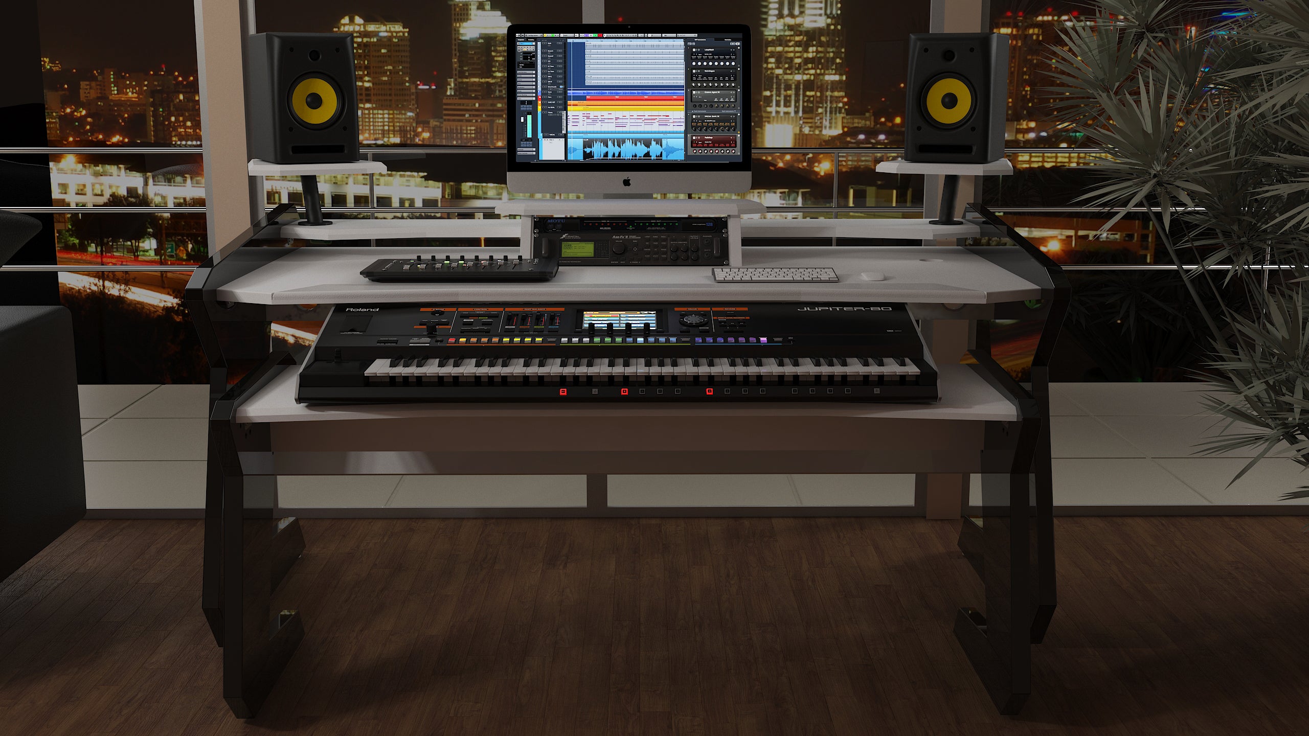 Organize your complete studio workstation on this perfectly optimized ergonomic space. A brand new state-of-the-art design brings a new shine to your studio. Careful planning of this desk allows you to have your complete studio set-up in a very limited space. Centered Rack space with 3U rack bay is always within your reach. There are additional 1U rack spaces on each side of the rack bay. The keyboard stand will fit the biggest up to 15 cm in height, 88 key workstations on the market. Once the keyboard is in place, your keys will match piano height for the best playing experience. The keyboard stand on casters is high enough to provide you comfortable leg space. Pull the keyboard stand out when you need to play. Don't worry it is on casters. Push it under the desk when you don't. Swivel speaker shelves can be easily moved left and right allowing you to find your perfect sweet spot. Shelves holders are designed to hold safely up to 16 kg (35 lbs) speakers. The comfortable padded armrest is available in 3 colors, Black, Wine Red, and Ferrari Red. Please check pictures in the gallery and leave remark during checkout. For additional colors please contact us. Cable management will hide your cables out from the site. Additional rack space for up to 8 standard rack units is optional by adding a floor rack cabinet on casters.