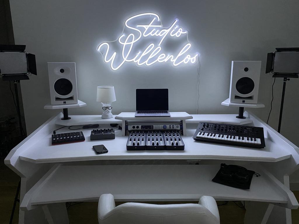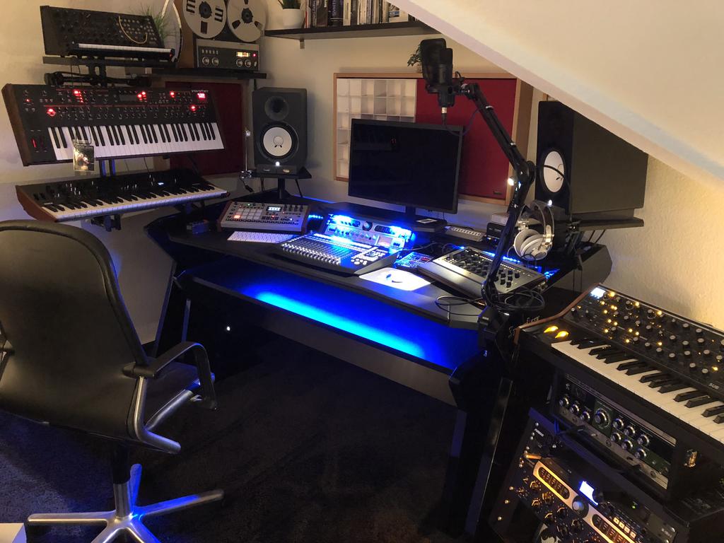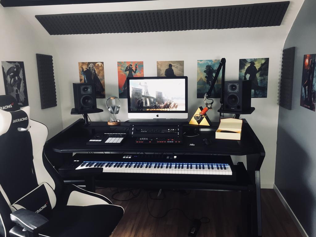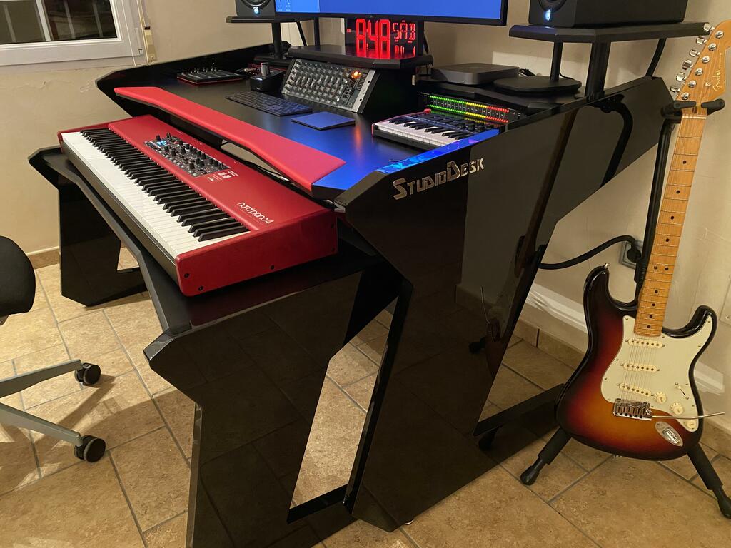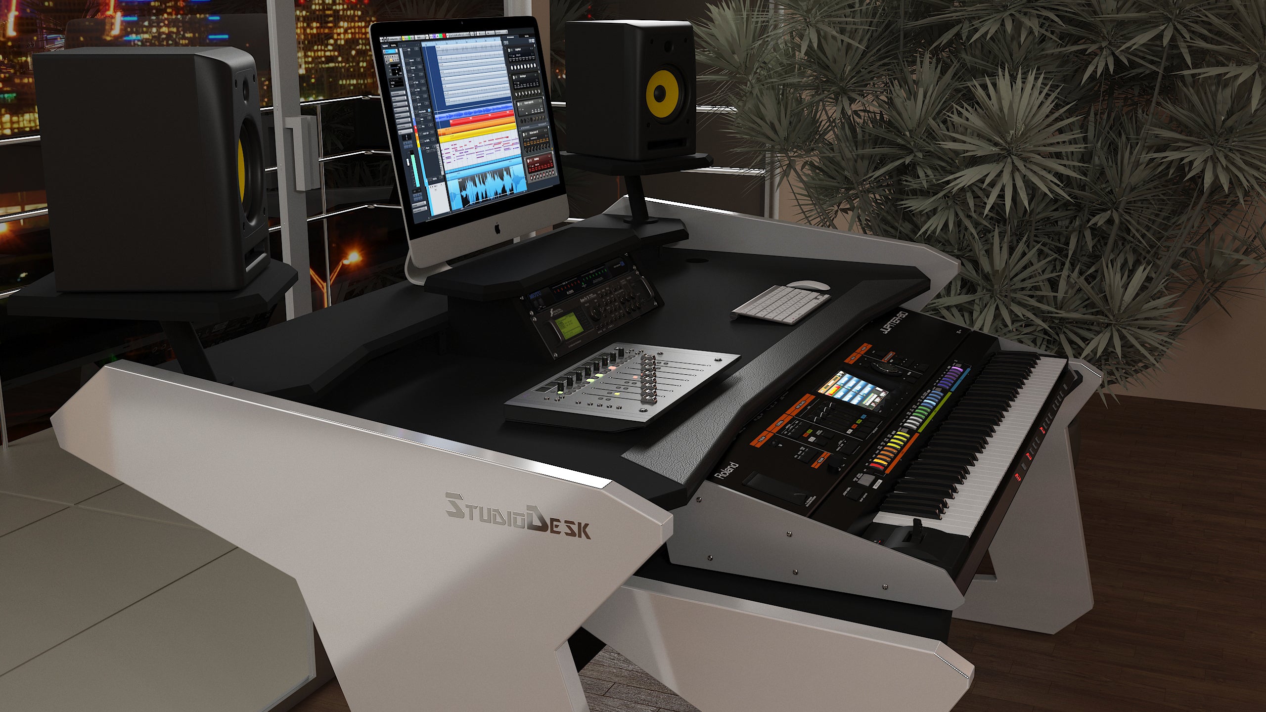 Organize your complete studio workstation on this perfectly optimized ergonomic space. A brand new state-of-the-art design brings a new shine to your studio. Careful planning of this desk allows you to have your complete studio set-up in a very limited space. Centered Rack space with 3U rack bay is always within your reach. There are additional 1U rack spaces on each side of the rack bay. The keyboard stand will fit the biggest up to 15 cm in height, 88 key workstations on the market. Once the keyboard is in place, your keys will match piano height for the best playing experience. The keyboard stand on casters is high enough to provide you comfortable leg space. Pull the keyboard stand out when you need to play. Don't worry it is on casters. Push it under the desk when you don't. Swivel speaker shelves can be easily moved left and right allowing you to find your perfect sweet spot. Shelves holders are designed to hold safely up to 16 kg (35 lbs) speakers. The comfortable padded armrest is available in 3 colors, Black, Wine Red, and Ferrari Red. Please check pictures in the gallery and leave remark during checkout. For additional colors please contact us. Cable management will hide your cables out from the site. Additional rack space for up to 8 standard rack units is optional by adding a floor rack cabinet on casters.