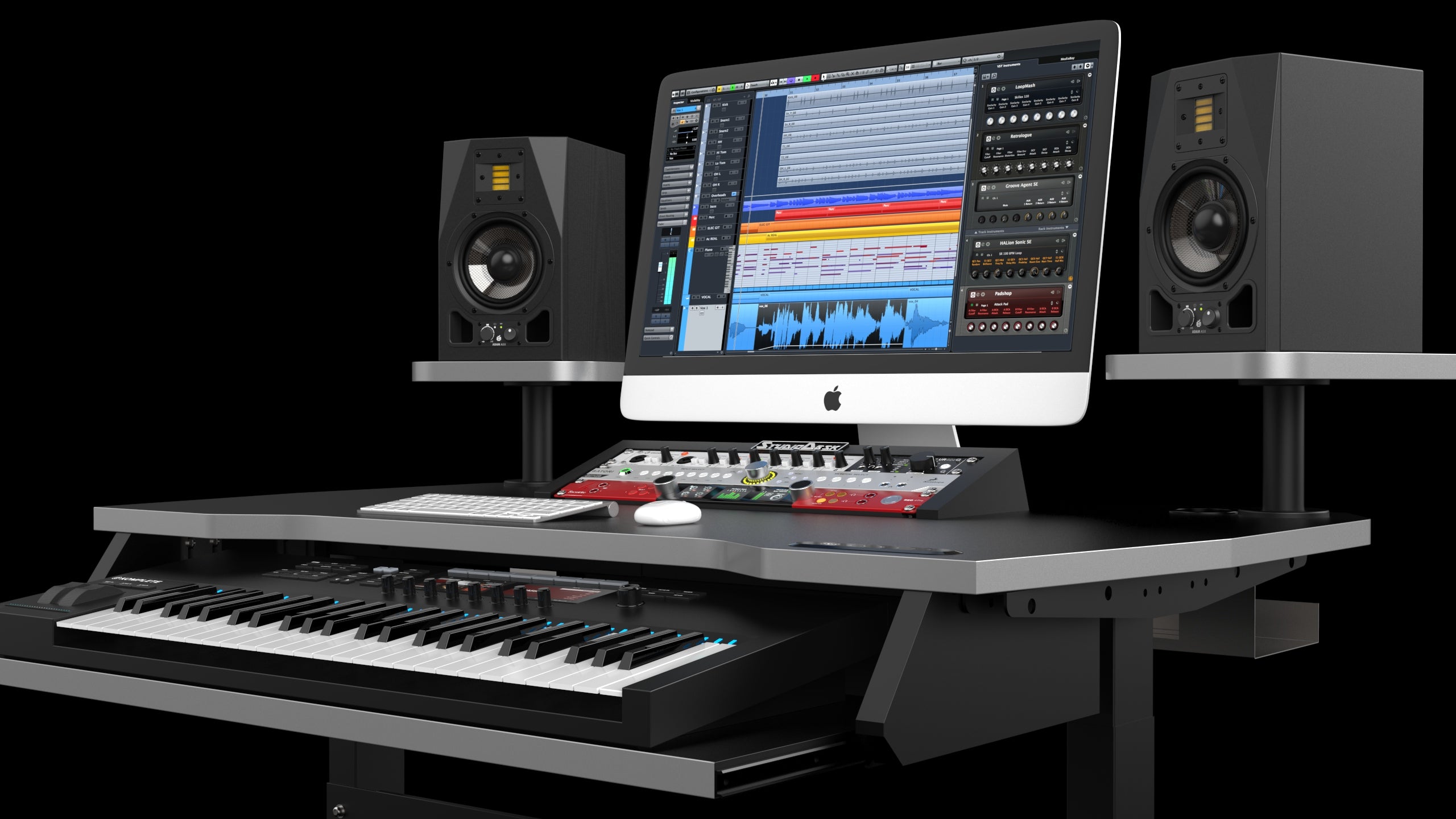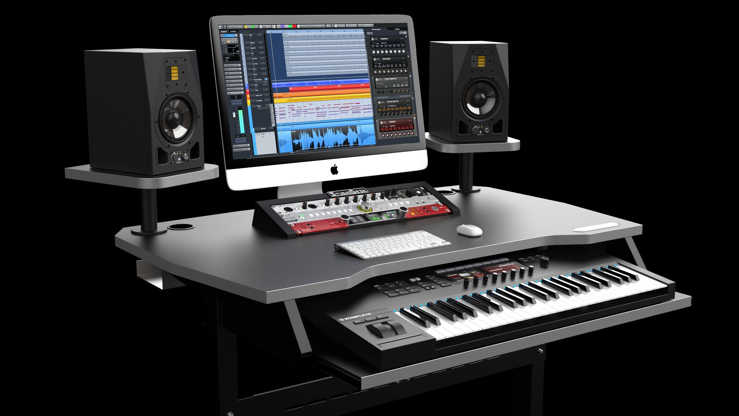 The Spirit was designed having in mind a bedroom producer who requires all the features of the professional desk on the smallest possible footprint. Spirit Workstation leans on our Electric platform used with the Fantom series. The memory controller for the electric platform is embedded into the laminated desk surface providing a scratch-free environment. Carefully planned desk real estate gives you space for a perfectly angled 3 U rack outboard gear and screens up to 29". Separate elevated swivel speaker shelves are strategically placed to leave as much as possible room to other gear on the desk. An optional keyboard pull-out shelf will allow you to have your MIDI keyboard up to 49 keys strategically positioned one tear lower leaving you with the maximum real estate on the desk. The keyboard pull-out shelf is adjustable in height to match virtually any keyboard height in the market. Its pull-out tray can be pulled out up to 27 cm. The lock mechanism will keep the tray in place while extended so it will not move while playing. All the cable inlays end up in the optional Cable management tray under the desk surface.